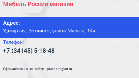 Мебель России, магазин по адресу Удмуртия, Воткинск, улица Марата, 14а в дальнейшем Организация, размещена в следующих категориях: