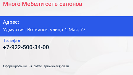 Много Мебели, сеть салонов по адресу Удмуртия, Воткинск, улица 1 Мая, 77 в дальнейшем Организация, размещена в следующих категориях: