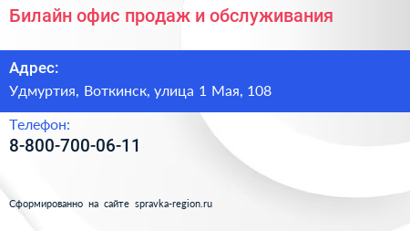 Билайн, офис продаж и обслуживания по адресу Удмуртия, Воткинск, улица 1 Мая, 108 в дальнейшем Организация, размещена в следующих категориях: