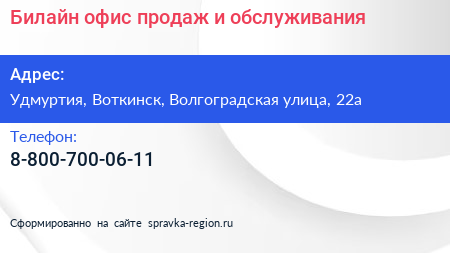 Билайн, офис продаж и обслуживания по адресу Удмуртия, Воткинск, Волгоградская улица, 22а в дальнейшем Организация, размещена в следующих категориях: