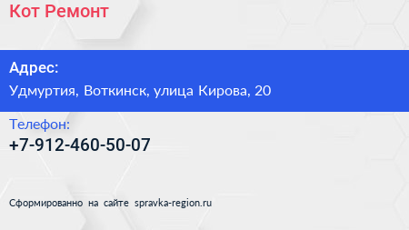 Кот Ремонт по адресу Удмуртия, Воткинск, улица Кирова, 20 в дальнейшем Организация, размещена в следующих категориях:
