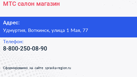 МТС, салон-магазин по адресу Удмуртия, Воткинск, улица 1 Мая, 77 в дальнейшем Организация, размещена в следующих категориях: