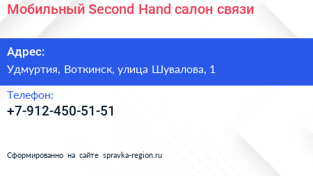 Мобильный Second Hand, салон связи по адресу Удмуртия, Воткинск, улица Шувалова, 1 в дальнейшем Организация, размещена в следующих категориях: