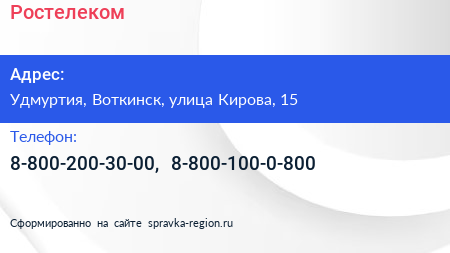 Ростелеком по адресу Удмуртия, Воткинск, улица Кирова, 15 в дальнейшем Организация, размещена в следующих категориях: