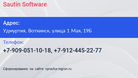 Sautin Software по адресу Удмуртия, Воткинск, улица 1 Мая, 19Б в дальнейшем Организация, размещена в следующих категориях: