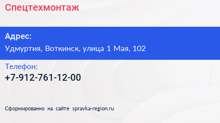 Спецтехмонтаж по адресу Удмуртия, Воткинск, улица 1 Мая, 102 в дальнейшем Организация, размещена в следующих категориях: