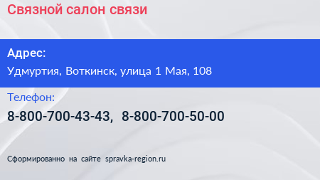 Связной, салон связи по адресу Удмуртия, Воткинск, улица 1 Мая, 108 в дальнейшем Организация, размещена в следующих категориях: