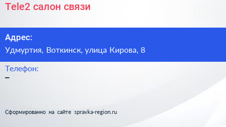 Tele2, салон связи по адресу Удмуртия, Воткинск, улица Кирова, 8 в дальнейшем Организация, размещена в следующих категориях:
