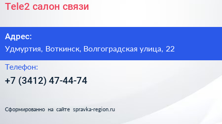 Tele2, салон связи по адресу Удмуртия, Воткинск, Волгоградская улица, 22 в дальнейшем Организация, размещена в следующих категориях: