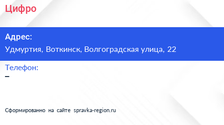 Цифро по адресу Удмуртия, Воткинск, Волгоградская улица, 22 в дальнейшем Организация, размещена в следующих категориях:
