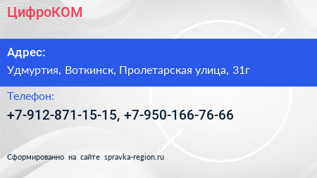 ЦифроКОМ по адресу Удмуртия, Воткинск, Пролетарская улица, 31г в дальнейшем Организация, размещена в следующих категориях: