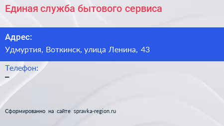 Единая служба бытового сервиса по адресу Удмуртия, Воткинск, улица Ленина, 43 в дальнейшем Организация, размещена в следующих категориях: