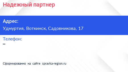 Надежный партнер по адресу Удмуртия, Воткинск, Садовникова, 17 в дальнейшем Организация, размещена в следующих категориях: