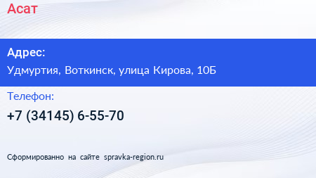 Асат по адресу Удмуртия, Воткинск, улица Кирова, 10Б в дальнейшем Организация, размещена в следующих категориях: