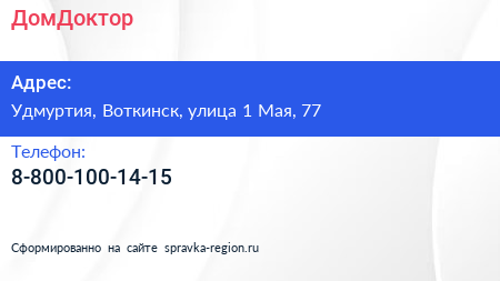 ДомДоктор по адресу Удмуртия, Воткинск, улица 1 Мая, 77 в дальнейшем Организация, размещена в следующих категориях:
