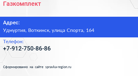 Газкомплект по адресу Удмуртия, Воткинск, улица Спорта, 164 в дальнейшем Организация, размещена в следующих категориях: