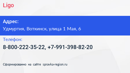 Ligo по адресу Удмуртия, Воткинск, улица 1 Мая, 6 в дальнейшем Организация, размещена в следующих категориях: