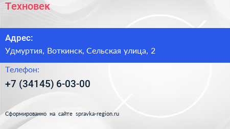 Техновек по адресу Удмуртия, Воткинск, Сельская улица, 2 в дальнейшем Организация, размещена в следующих категориях: