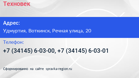 Техновек по адресу Удмуртия, Воткинск, Речная улица, 20 в дальнейшем Организация, размещена в следующих категориях: