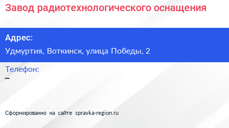Завод радиотехнологического оснащения по адресу Удмуртия, Воткинск, улица Победы, 2 в дальнейшем Организация, размещена в следующих категориях: