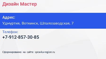 Дизайн-Мастер по адресу Удмуртия, Воткинск, Шпалозаводская, 7 в дальнейшем Организация, размещена в следующих категориях:
