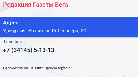 Редакция Газеты Вега по адресу Удмуртия, Воткинск, Робеспьера, 20 в дальнейшем Организация, размещена в следующих категориях:
