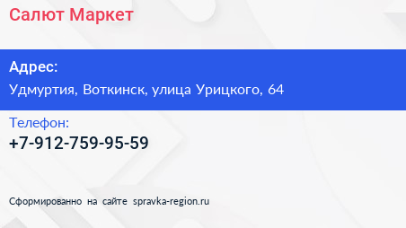 Салют Маркет по адресу Удмуртия, Воткинск, улица Урицкого, 64 в дальнейшем Организация, размещена в следующих категориях: