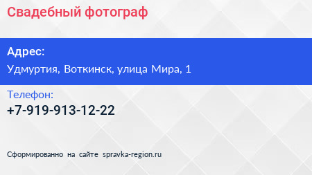 Свадебный фотограф по адресу Удмуртия, Воткинск, улица Мира, 1 в дальнейшем Организация, размещена в следующих категориях: