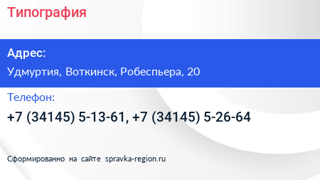 Типография по адресу Удмуртия, Воткинск, Робеспьера, 20 в дальнейшем Организация, размещена в следующих категориях:
