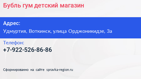 Бубль-гум, детский магазин по адресу Удмуртия, Воткинск, улица Орджоникидзе, 3а в дальнейшем Организация, размещена в следующих категориях:
