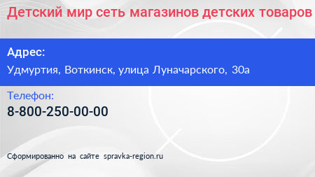 Детский мир, сеть магазинов детских товаров по адресу Удмуртия, Воткинск, улица Луначарского, 30а в дальнейшем Организация, размещена в следующих категориях: