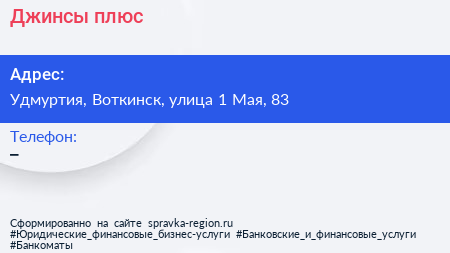 Джинсы плюс по адресу Удмуртия, Воткинск, улица 1 Мая, 83 в дальнейшем Организация, размещена в следующих категориях:
