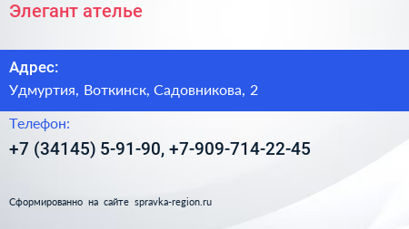 Элегант, ателье по адресу Удмуртия, Воткинск, Садовникова, 2 в дальнейшем Организация, размещена в следующих категориях: