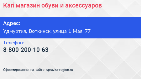Kari, магазин обуви и аксессуаров по адресу Удмуртия, Воткинск, улица 1 Мая, 77 в дальнейшем Организация, размещена в следующих категориях: