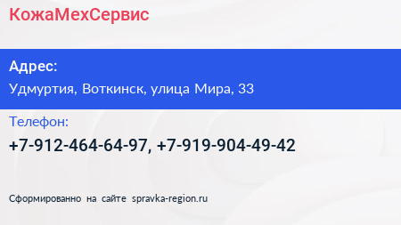 КожаМехСервис по адресу Удмуртия, Воткинск, улица Мира, 33 в дальнейшем Организация, размещена в следующих категориях: