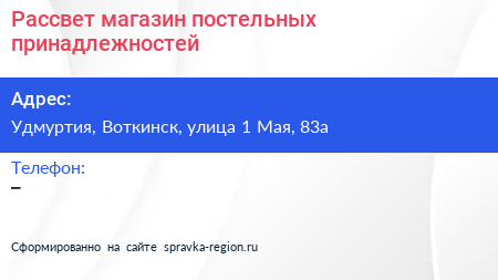Рассвет, магазин постельных принадлежностей по адресу Удмуртия, Воткинск, улица 1 Мая, 83а в дальнейшем Организация, размещена в следующих категориях: