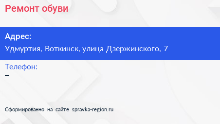 Ремонт обуви по адресу Удмуртия, Воткинск, улица Дзержинского, 7 в дальнейшем Организация, размещена в следующих категориях: