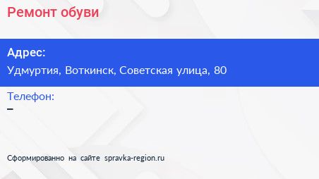 Ремонт обуви по адресу Удмуртия, Воткинск, Советская улица, 80 в дальнейшем Организация, размещена в следующих категориях: