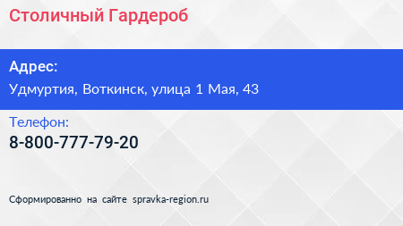 Столичный Гардероб по адресу Удмуртия, Воткинск, улица 1 Мая, 43 в дальнейшем Организация, размещена в следующих категориях: