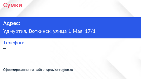 Сумки по адресу Удмуртия, Воткинск, улица 1 Мая, 17/1 в дальнейшем Организация, размещена в следующих категориях: