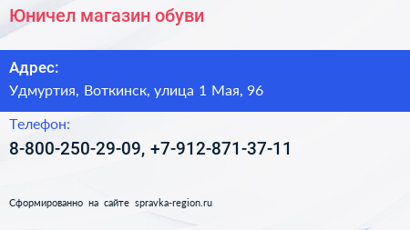 Юничел, магазин обуви по адресу Удмуртия, Воткинск, улица 1 Мая, 96 в дальнейшем Организация, размещена в следующих категориях: