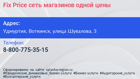 Fix Price, сеть магазинов одной цены по адресу Удмуртия, Воткинск, улица Шувалова, 3 в дальнейшем Организация, размещена в следующих категориях: