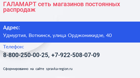 ГАЛАМАРТ, сеть магазинов постоянных распродаж по адресу Удмуртия, Воткинск, улица Орджоникидзе, 40 в дальнейшем Организация, размещена в следующих категориях: