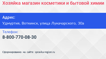 Хозяйка, магазин косметики и бытовой химии по адресу Удмуртия, Воткинск, улица Луначарского, 30а в дальнейшем Организация, размещена в следующих категориях: