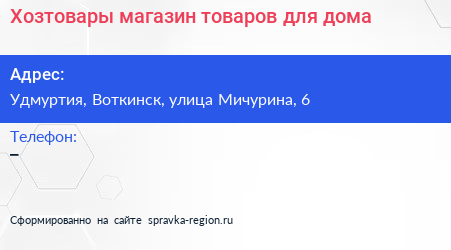 Хозтовары, магазин товаров для дома по адресу Удмуртия, Воткинск, улица Мичурина, 6 в дальнейшем Организация, размещена в следующих категориях: