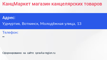 КанцМаркет, магазин канцелярских товаров по адресу Удмуртия, Воткинск, Молодёжная улица, 13 в дальнейшем Организация, размещена в следующих категориях: