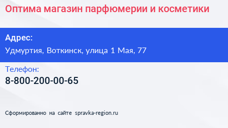Оптима, магазин парфюмерии и косметики по адресу Удмуртия, Воткинск, улица 1 Мая, 77 в дальнейшем Организация, размещена в следующих категориях:
