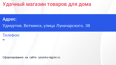 Удачный, магазин товаров для дома по адресу Удмуртия, Воткинск, улица Луначарского, 38 в дальнейшем Организация, размещена в следующих категориях: