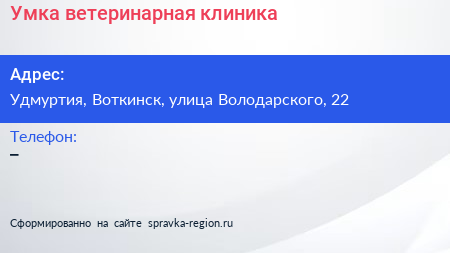 Умка, ветеринарная клиника по адресу Удмуртия, Воткинск, улица Володарского, 22 в дальнейшем Организация, размещена в следующих категориях: