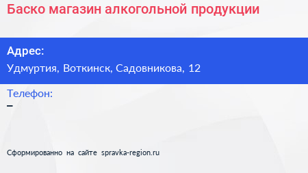 Баско, магазин алкогольной продукции по адресу Удмуртия, Воткинск, Садовникова, 12 в дальнейшем Организация, размещена в следующих категориях: